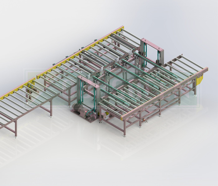 使用機械推手將板材推入碼垛堆疊,堆疊成包裝要求高度,輸出打包。